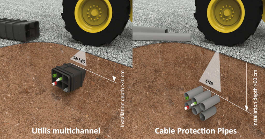 Teknisk infrastruktur under bakken øker, og behovet for en plasseffektiv kabelhåndtering er mer nødvendig enn før. Utilis-systemet møter dette behovet, med et robust, flerkanaldesign som er enkelt å legge, og reduserer risiko for skader ved montering, da vekten er lav og bruk av maskiner er mindre. Utilis Multi Channel eliminerer behovet for oppgravinger i ettertid, da systemet er designet for fremtidige kabelføringer. Dette systemet er et godt alternativ til dagens støpte rør-løsninger i betong. Dimensjon på kanalløsningen tilsvarer 110mm og produseres i 4, 6 og 9 løp.